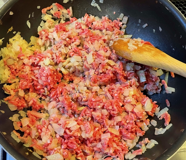 ⑥まな板にクッキングシートを敷き、牛こま切れ肉を切って⑤のフライパンに入れて焼肉のたれを小さじ2投入。