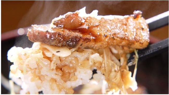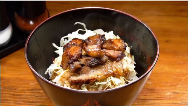 追加メニューはこちらも人気の一品。脂のり抜群の国産豚バラ肉を備長炭で一気にあぶり、香ばしさと脂の甘みを引き出したら、焼き鳥に使用している甘辛濃厚ダレにくぐらせてごはんとキャベツの上に乗せて完成です。