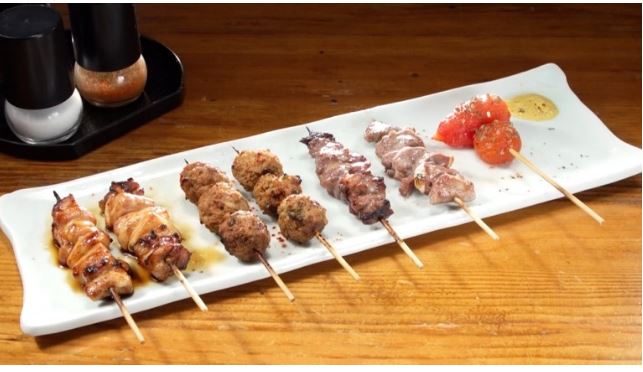 焼き鳥は左からとり、おやじだんご、豚かしら、豚たん、ミニトマト。