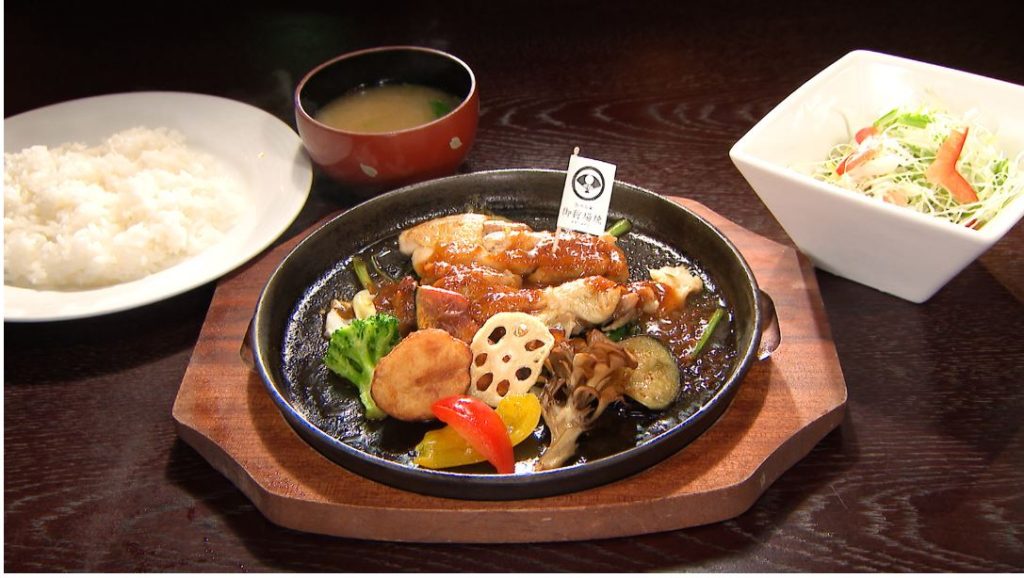 茹でたキャベツと小松菜を鉄板に乗せ、地元産のなす、かぼちゃ、舞茸を乗せて焼いた鶏肉も豪快に盛りつけます。そこに山椒味噌をたっぷりと。山椒味噌はお店オリジナルで、山椒、砂糖、安藤醸造さんの味噌を合わせたソースです。あきたこまちの新米と一緒にいただきます!