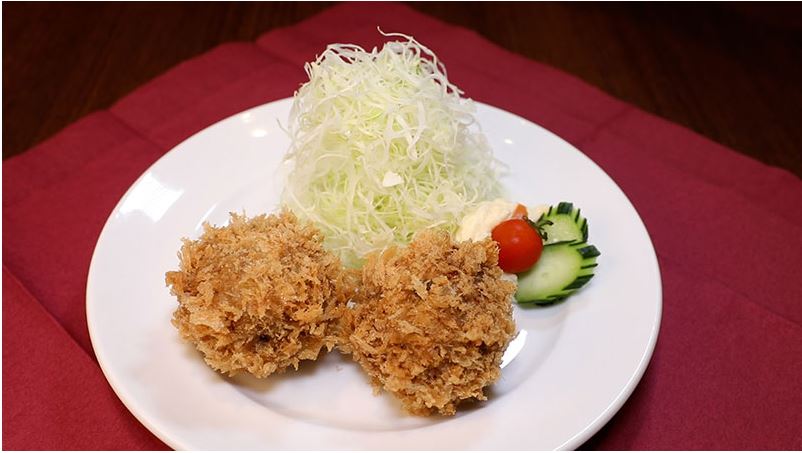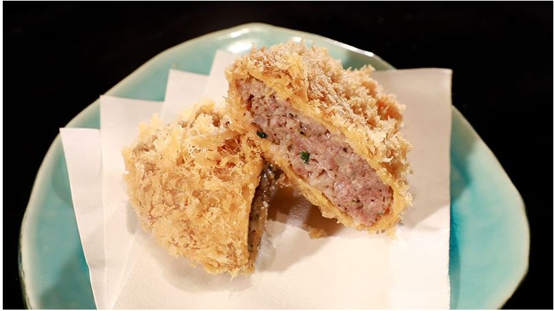 ●脂の入りがよく、ジューシーな国産豚の胸肉を二度挽きにしてきめ細かい合いびき肉にし、炒めた玉ねぎには塩コショウなどを加えたものを混ぜて吸油率の低い生パン粉をつけ、170℃の油でからりと揚げている。