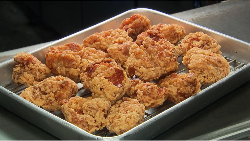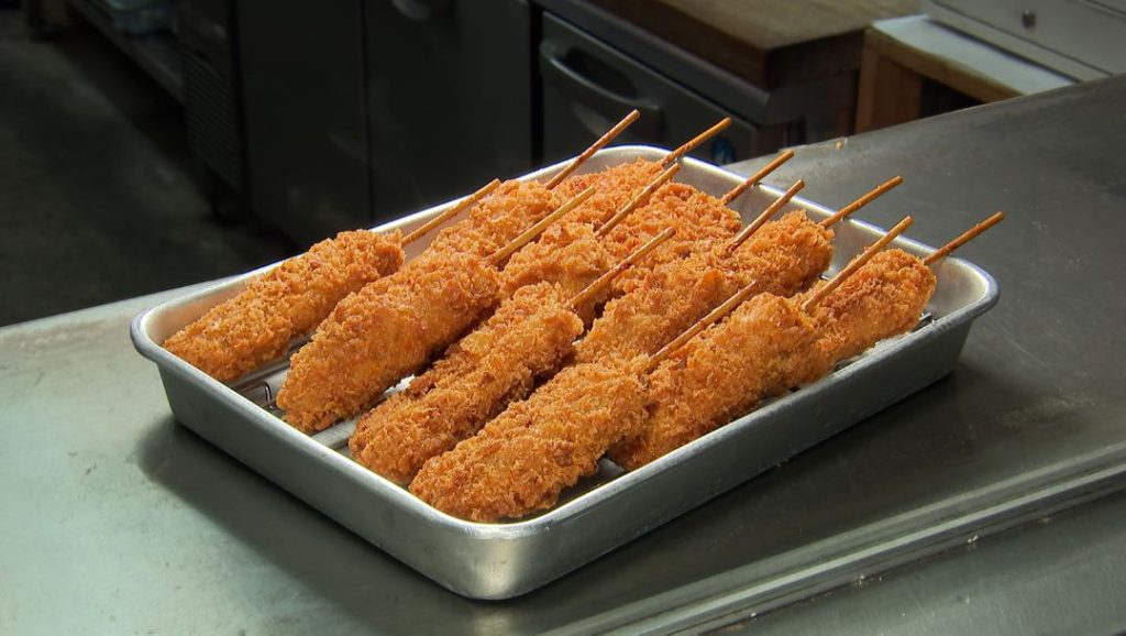揚げたてをご用意してくださり、一口食べた日村さん「うわ~!うめぇ~!」「肉の旨みがすごいよ、これうまい!」続いては唐揚げ。オススメはされていませんでしたが、せっかくなので頂きます!崎本商店さんの唐揚げは、にんにく、生姜が効いた醤油ダレに漬け込んだ一品。「あぁうまい!」と日村さん。続いて串カツもいただきます!「これなんでソースいらないの、さっきから」と日村さん。塩コショウの下味がしっかり効いた濃いめの味わいなので、ソースいらずなのだそう。