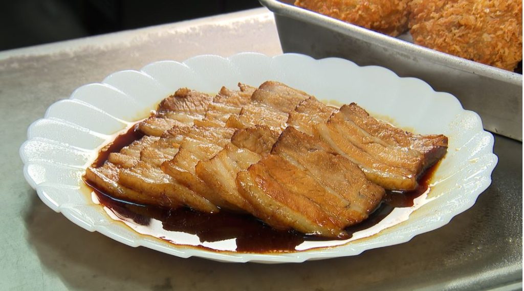 ついにオススメされた2品目の煮豚の登場です。瀬戸内豚のばら肉を、にんにくの効いた特製醤油ダレで煮込みます。豚のあまみとパンチのある味わいが食欲をそそる、崎本商店さんの煮豚です。「これ強烈だぜ~!」「これ豚もものすごい柔らかい。脂もとろっとしてうまい。このタレもうまい!」食べているとごはんと食べると美味しいということでおにぎりも出してくれました。「米に合うわ、ベストコンビだね。」「しばらく煮豚食えないわ他で。うますぎる」相当美味しい煮豚だったようです。