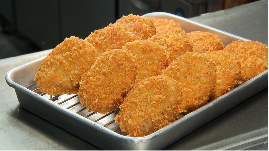 一番人気のコロッケは、牛ステーキ肉などを使ったひき肉と人参、玉ねぎを甘辛い醤油ダレで煮込み、ふかしたじゃがいもと合わせ、味がしみわたるようしっかりと混ぜ合わせます。170℃の油でおよそ3分揚げれば絶品コロッケに。