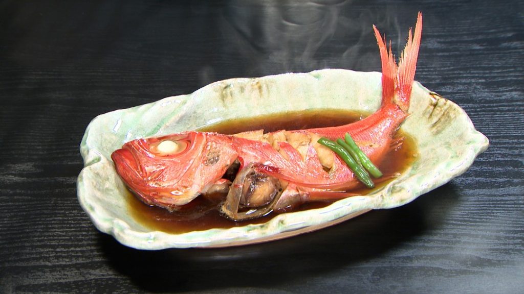 ●金目鯛の煮付けは、醤油をベースにした甘じょっぱいたれで煮込む。金目鯛は銚子つりきんめを使用。仕上げにきんめ鯛のうまみが詰まったたれを金目鯛の煮付けにたっぷりかける。