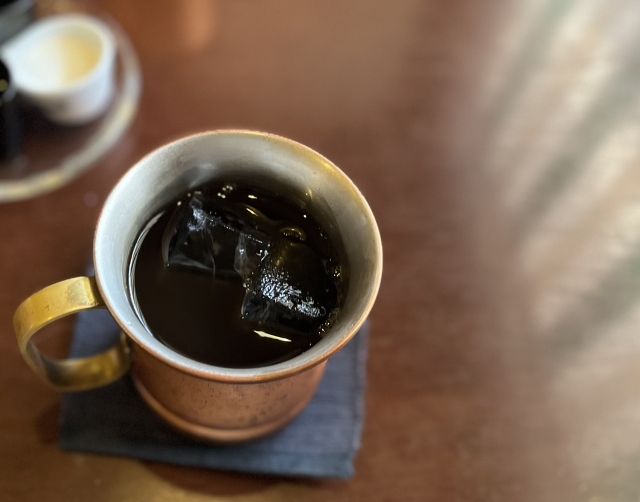 アイスコーヒーは銅のマグカップで。「コクがありますね、氷が溶けてちょうどいい感じ。おいしい。」音楽はくるみ割り人形から「作品71a 花のワルツ」、「作品71a 行進曲」が流れてきました。飯尾さんは行進曲を聴いてテンションを上げているそう。