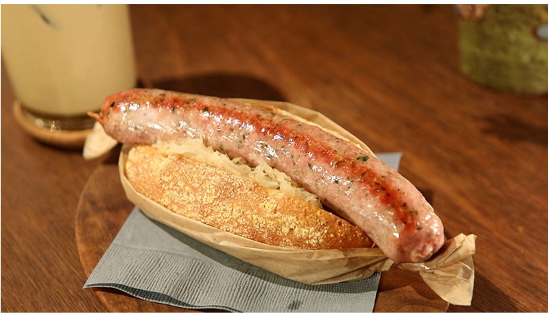 ●特注のソーセージは、一度茹でたあとにフライパンで焼くことで、表面がパリパリに。パンにはオリーブオイルを練り込み、あえて膨らませずもっちりとした仕上がりに。