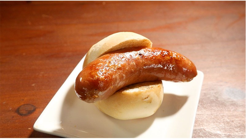 ●尾山台のシャルキュトリ、オーボンヴュ―タンさんのここでしか味わえないオリジナルソーセージ。10分以上しっかり火を通すことでパリッとジューシーな仕上がりに。