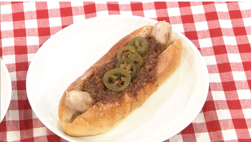 ●チリドッグはホットドッグの上から粗挽きの牛肩ロースに数種類のスパイス、玉ねぎ、トマトソースなどを煮込んだものをかけている。「このソーセージ美味い。すごい繊細。ソーセージが。これ(上に乗っているソース)うまい。これだけ色々かけたい。」