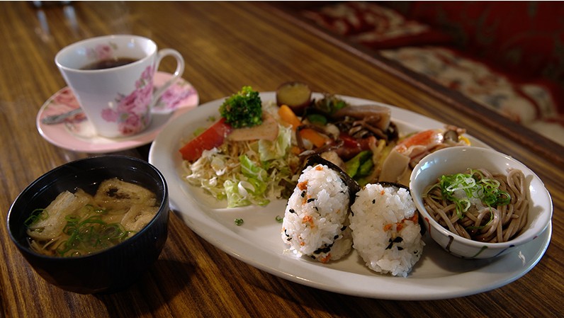 ●モーニングはおにぎり、味噌汁はもちろんサラダ、あんかけかに玉、季節の野菜、そばまでついてくる。